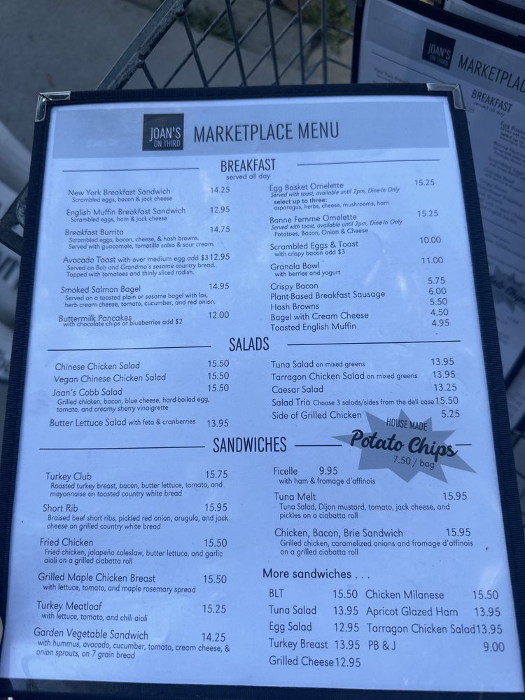 Joan's on Third in Los Angeles is a bustling cafe loved for its delectable breakfast and brunch offerings. With a welcoming ambiance and friendly service, the restaurant offers a mini market vibe and a unique dining experience. Their Chinese Chicken Salad is a standout dish, featuring generous portions of crispy chicken and a flavorful sesame dressing. The meatloaf and fried chicken sandwich are also highly recommended. The menu caters to various dietary preferences, including vegan and vegetarian options. The indoor and outdoor seating options provide a comfortable dining experience. The staff is attentive and the owner, Joan, is known for her warmth and hospitality. Joan's on Third is a perfect spot for a quick lunch, a delightful meal, or for picking up unique gifts from their merchandise area. Visit this charming cafe for a memorable culinary experience.